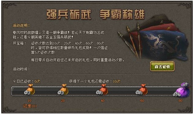 本帖最后由 鹿玲飘飘 于 2014-1-2 10:01 编辑 【活动时间】:1月2日0:00—24:00【活动内容】:开宝箱:征收次数达到10次、20次、40次、60次、80次时,可领取大量银币礼包!1次强征等于5次普通征收!礼包清空时间 ...