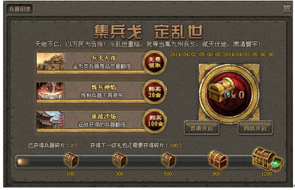《傲视天地》兵器回馈活动 【活动时间】:8月10日凌晨5:00——8月11日凌晨5:00【活动范围】:已开启兵器系统的玩家【活动内容】:a) 活动期间,通过购买BUFF提高兵器产量b) &nb ...