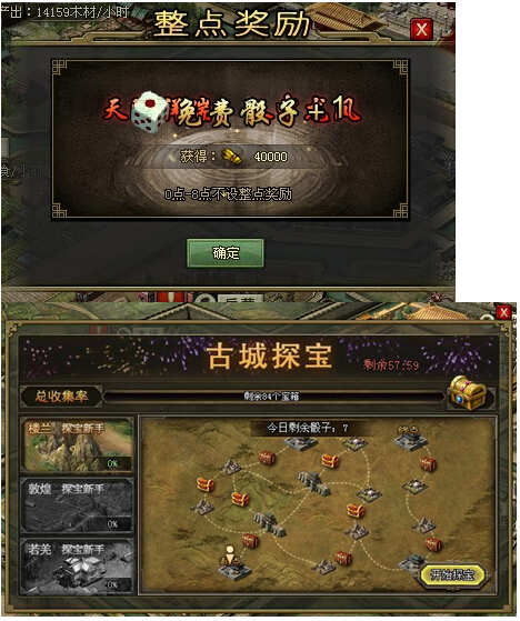 【珍宝好运来】勇闯三大古城,探寻好礼秘宝! 楼兰、敦煌、若羌,三大古城闪耀亮相!每座古城,蕴含着大量经验、粮食等多种财富,更有马踏飞燕、角形玉杯两大新宝物等你探宝巧夺得!来吧!热血开始我们的探宝之旅! ...
