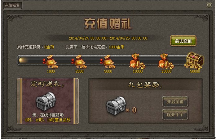 《傲视天地》充值送礼活动公告 活动时间:9月24日0点--24点活动规则:累计充值达到一定的额度,就可以领取对应的充值礼包 充值礼包可获得金币,宝石,点券等丰厚奖励 充值50000金币即可额外获得大满贯奖励 大满贯奖 ...