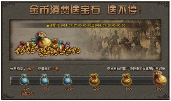 消费送宝石活动活动时间:9月24日0点--24点活动规则:每消费金币达到一定数目,就可以领取对应宝石礼包 累计最高可获得34000宝石 活动每日0点清空礼包并重置记录 ...
