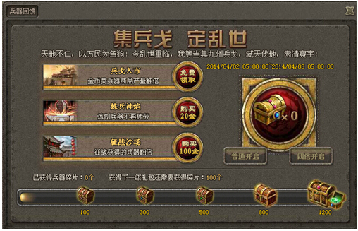 《傲视天地》兵器回馈活动 【活动时间】:9月26日凌晨5:00——9月27日凌晨5:00【活动范围】:已开启兵器系统的玩家【活动内容】:a) 活动期间,通过购买BUFF提高兵器产量b) &nb ...