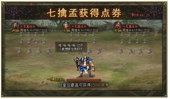 【新七擒孟获】三路大军连擒孟获,宝箱连开点券狂送! 活动范围:10月5日(含)之前已开所有服 活动时间:10月12日0点至10月13日24点 参与条件:已开启世界地图 活动玩法:活动期间,通过任意战斗中的“借兵”(除 ...