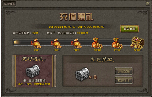 《傲视天地》充值送礼活动公告 活动时间:11月25日0点--24点活动规则:1) 累计充值达到一定的额度,就可以领取对应的充值礼包2) 充值礼包可获得金币,宝石,点券等丰厚奖励3) 充值50000金币即可额外获得大满贯奖 ...