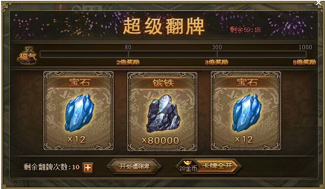 超级翻牌,好礼最高5倍送! 粮食、镔铁、宝石、经验、免费借兵等多种翻牌奖励,轻松获得,极致满足。鸿运当头,不断翻到“福气牌”,不停累积“福气值”,更能豪享最高5倍奖励! 只有1天,机不可失! 活动范围:1月2 ...