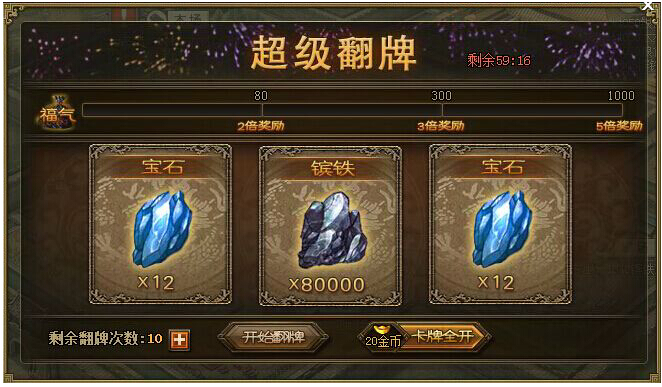 超级翻牌,好礼最高5倍送! 粮食、镔铁、宝石、经验、免费借兵等多种翻牌奖励,轻松获得,极致满足。鸿运当头,不断翻到“福气牌”,不停累积“福气值”,更能豪享最高5倍奖励! 只有1天,机不可失! 活动范围:2月1 ...