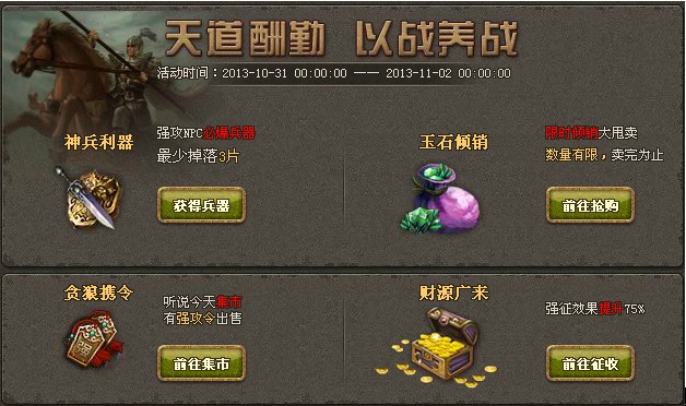 本帖最后由 方块的世界D 于 2014-1-28 22:59 编辑 《傲世天地》1月29日 玉石倾销&兵器活动公告 【活动时间】:1月29日0:00——24:00【活动内容】:1. 天道酬勤,以战养战a) &n ...