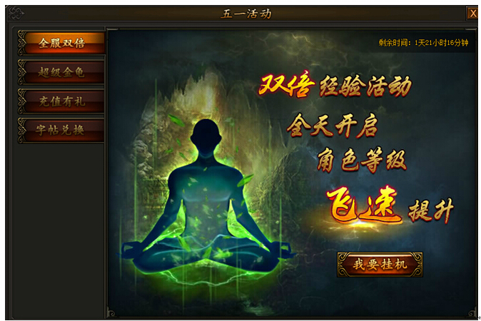 喜迎五一,《传奇霸业》四大活动齐助阵,海量道具大放送! 活动一:全服双倍 活动时间:2015年4月30日至5月2日 全服双倍经验活动连开三天,海量经验拿到手软,角色等级飞速提升,赶快和小伙伴们努力刷怪吧~ ...