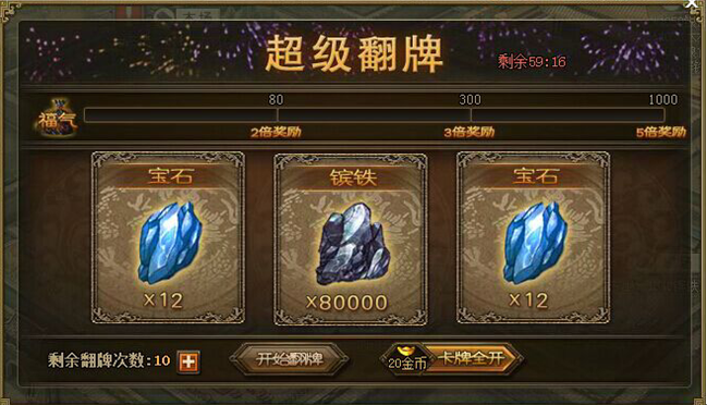 《攻城掠地》5月7日 活动公告 活动公告 活动一超级翻牌,好礼最高5倍送! 粮食、镔铁、宝石、经验、免费借兵等多种翻牌奖励,轻松获得,极致满足。鸿运当头,不断翻到“福气牌”,不停累积“福气值”,更能豪享最高5 ...