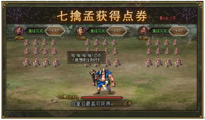 本帖最后由 冥王Fan 于 2015-5-31 23:47 编辑 【七擒孟获】三路大军连擒孟获,宝箱连开点券狂送! 活动范围:5月25日(含)之前已开所有服 活动时间:6月1日0点至6月2日24点 参与条件:已开启世界地图 活动玩法: ...