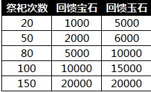 祭祀活动活动时间:7月9日5:00——7月10日5:00活动内容:1. 通过祭祀可以获得银币、军功、点券、玉石、宝石,活动期间祭祀效果翻倍,暴击效果翻倍!2. 祭祀到一定 ...