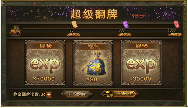 本帖最后由 冥王Fan 于 2015-7-11 23:18 编辑 【新】超级翻牌,双倍宝石奖励!拥有丝绸优惠券奖励赠送之后,“超级翻牌”活动奖励再次升级!自本次起,活动中的宝石奖励,双倍奉送!助各位将军,早登王座,速成霸 ...