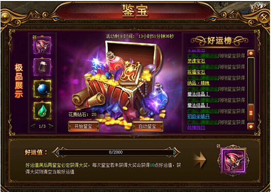 鉴宝活动时间:2015年7月14日00:00:00-2015年7月14日23:59:59活动范围:全平台玩家活动内容:每次鉴宝需消耗20钻,将有几率获得以下奖励中的一种:时装-战神蚀日*1、生命宝石*1、绝品·精魄*2、初级坐骑丹*2、神器提 ...