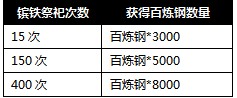 新镔铁祭祀,神兵就送百炼钢! 新改版四大镔铁活动之“新镔铁祭祀”,今日率先上线!新镔铁祭祀全新为已开启神兵的玩家,福利新增“百炼钢”奖励,只需完成相应次数的镔铁祭祀,或熔化本活动奖励道具,即可轻松获得 ...