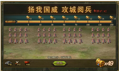 【致阅兵】攻城送宝箱,海量镔铁送送送!纪念反法西斯胜利70周年,向伟大的勇士先辈们致敬!在这特殊的日子里,我们为大家准备了一个极其特别的大阅兵活动,活动中大家还可获得大量的镔铁好礼噢!活动范围:8月4日( ...