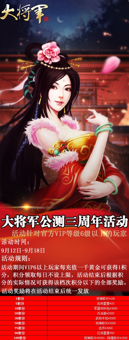 本帖最后由 鳳鳴岐山 于 2015-9-11 17:53 编辑 《大将军》公测三周年VIP活动 活动时间:9月12日-9月18日 温馨提示: 活动结束后5个工作日内,会有专门工作人员统计并进行发放内会自动发送到符合条件的玩家包裹 ...