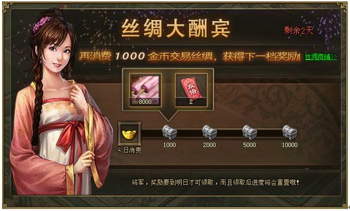活动一新丝绸商铺3天大酬宾,首日免费赠送丝绸优惠券!活动范围:8月23日(含)之前所有已开在线服活动时间:9月22日0点至9月24日24点参与条件:已开启丝绸之路的玩家活动内容:1. 活动首 ...