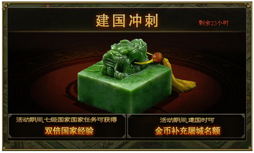 本帖最后由 大猫和小老鼠 于 2015-9-24 22:00 编辑 建国冲刺,国家经验翻倍升! 建国王朝,梦想加速!“建国冲刺”活动全新推出,国家经验翻倍拿、屠城名额可金币增补,两大本活动专利,助力王朝竞速崛起! 活 ...