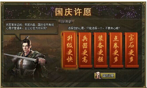 【国庆活动】国庆许愿,梦想成真! 国庆7天长假又将来临,在庆祝祖国的繁荣昌盛之际,也让我们一起为在游戏中许下那最美好的愿望!想升级更快?想兵器更高?想装备更强?想点券更多?想宝石更多?想有更多的丝绸锦囊 ...