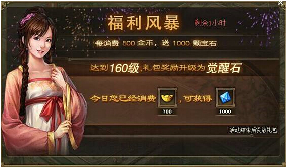 活动一:福利风暴,宝石、觉醒石狂享! 活动范围:8月29日(含)之前已开所有服 活动时间:9月28日0点至24点参与条件:90级(含)以上玩家 活动内容:活动期间,每次累计消耗满500金币,不同等级可对应获得一份宝石 ...