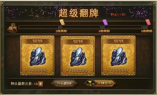 《攻城掠地》10月6日 活动公告 活动一:新超级翻牌,鸿运当头最高5倍送!粮食、镔铁、宝石、经验、免费借兵等多种翻牌奖励,轻松获得,极致满足。不断翻到“福气牌”,不停累积“福气值”,豪享最高5倍奖励!翻出 ...