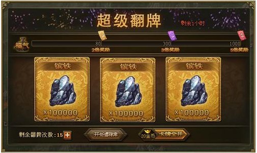 超级翻牌、天灯许愿 活动一:新超级翻牌,鸿运当头最高5倍送!粮食、镔铁、宝石、经验、免费借兵等多种翻牌奖励,轻松获得,极致满足。不断翻到“福气牌”,不停累积“福气值”,豪享最高5倍奖励!翻出“鸿运卡牌” ...