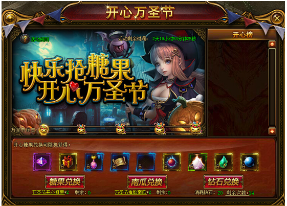 万圣节活动活动时间:2015.10.31 00:00:00-2015.11.1 23:59:59活动范围:所有160级以上的玩家活动内容:活动期间,玩家可以通过击杀160级以上的野外怪物有几率获得开心糖果以及鬼脸南瓜,捐献糖果及南瓜将有几率获得 ...