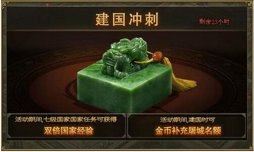 备战三级王朝,建国大冲刺 距离三级王朝上线时间已进入最后倒计时,在此前夕所有7级以上未建国国家,将进入最后疯狂冲刺阶段!11月3日至11月4日隆重巨献“建国冲刺”特别活动 ...