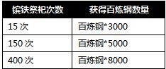 新钢铁祭祀、犒赏武将、洗练开光 活动一:新钢铁祭祀,神兵冲级大送钢! 好消息!福利大升级,已开启“神兵”的玩家,活动将直接升级为钢铁祭祀活动,玩家进行祭祀后,将获得百炼钢奖励;加速“神兵”等级的提升, ...