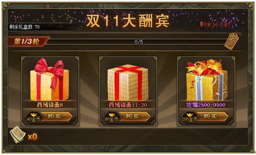 “双十一”狂欢节,双重好礼大放送“双十一”狂欢节,限时真情大回馈!精彩活动两连发;赠送海量珍贵丝绸,助你策马加鞭进击五大珍宝,更有大量功勋齐放送!活动一:双十一大酬宾,海量丝绸大回馈活动范围:10月12日 ...