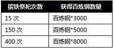镔铁祭祀、七擒孟获、广结名士 活动一:镔铁祭祀,神兵冲级大送钢! 好消息!福利大升级,已开启“神兵”的玩家,活动将直接升级为钢铁祭祀活动,玩家进行祭祀后,将获得百炼钢奖励;加速“神兵”等级的提升,早日 ...