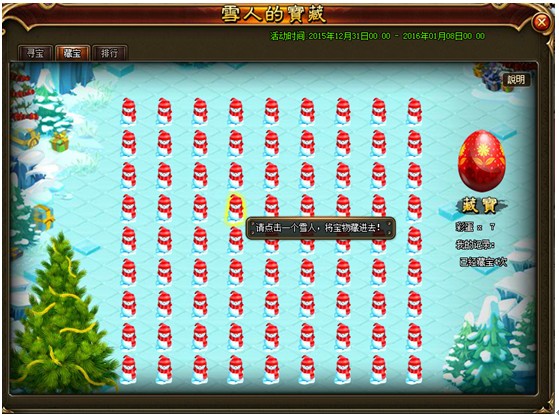 雪人宝藏活动雪人的宝藏活动已火热开启,玩家等级达到20级即可参与游戏。活动期间每藏1个彩蛋可随机获得1个藏宝箱,开启藏宝箱几率获得元宝、炼化石,玄兵附魔石等道具奖励。 另2015年12月31日——2 ...