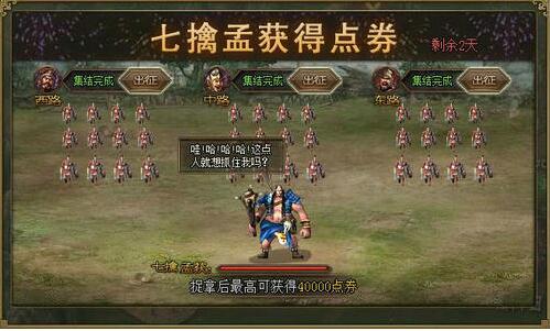 三路大军连擒孟获,宝箱连开点券狂送!活动范围:2015年12月21日(含)之前已开所有服 活动时间:2016年1月20日0点至1月21日24点 参与条件:已开启世界地图 活动玩法:活动期间,通过任意战斗中的“借兵”(除单人剧 ...