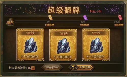 超级翻牌、宝石矿脉、精炼大放送、钢铁倾销、天降神剑、洗练开光 活动一:超级翻牌,鸿运当头最高5倍送!粮食、镔铁、宝石、经验、免费借兵等多种翻牌奖励,轻松获得,极致满足。不断翻到“福气牌”,不停累积“福 ...