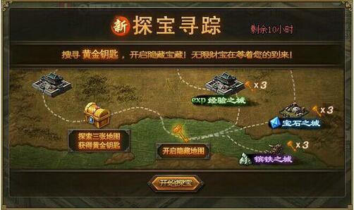 古城探宝 活动一:古城探宝,创新玩法乐不穷! 全新古城探宝活动,将大大缩短掷骰子的过程,由原新、老手地图改为三张普通古城地图,玩家在地图中探寻并收集“黄金钥匙”后,开启三大限时隐藏宝藏地图!无限财宝在 ...