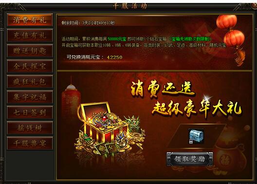 轮回灭世 千服庆典! 活动一:消费有礼 活动时间:5月25日—5月31日 活动范围:全服 活动内容:活动期间,累计消费每满50000元宝即可领取1个钻石宝箱(宝箱无领取次数限制),开启宝箱有机会获得本职业10转、8转 ...