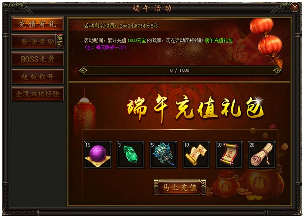 粽叶飘香话端午 双倍经验享不停 一丶首充有豪礼活动时间:6月9日——6月11日活动内容:活动期间,累计充值1000元宝,可在活动面板领取端午充值活动。充值礼包内容:法宝丹*15、灵石精华(中)*3、冰霜 ...