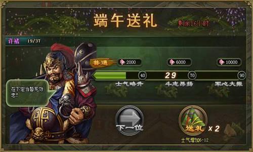 端午双重福利,备战跨服争霸! 庆端午,饮雄黄,猛醒诸葛!送香粽,振士气,狂揽丝绸锦囊!6月9日至6月11日,两大端午活动福利大放送!趁此绝佳时机,飙升战力,全力备战6月12日即将开启的跨服争霸赛! 端午活动一 ...