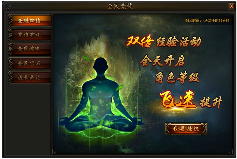 传奇霸业全民竞技活动震撼来袭,豪华奖励触手可得! 活动一:全服双倍活动时间:2016年6月16日0:00~6月20日23:59活动期间,双倍经验活动全天开启,打怪练级事半功倍!全服双倍可和VIP多倍经验、经验卷轴等叠加,海量 ...