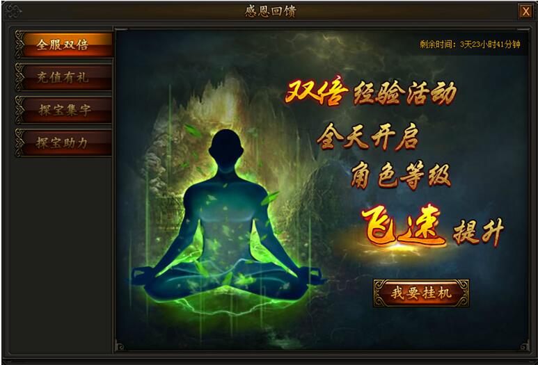 传奇霸业感恩回馈活动震撼来袭,丰厚奖励即刻领取! 活动一:全服双倍活动时间:2016年6月23日0:00~6月26日23:59活动期间,双倍经验活动全天开启,打怪练级事半功倍!全服双倍可和VIP多倍经验、经验卷 ...