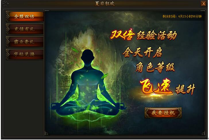 传奇霸业夏日狂欢,丰厚大礼即刻获得! 1. 全服双倍活动时间:2016年7月1日00:00 — 7月5日23:59活动期间内即可获得双倍经验效果加成,可与其他双倍经验叠加。 ...