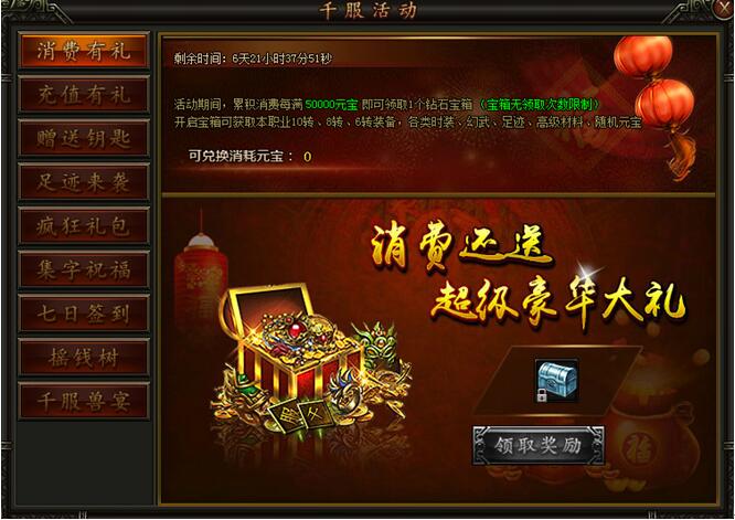 《铁血皇城》千服新高度 幻化翅膀疯狂来袭 活动一:消费有礼 活动时间:7月7日-7月13日活动范围:全服活动内容:活动期间,累计消费每满50000元宝即可领取1个钻石宝箱(宝箱无领取次数限制),开启宝箱有 ...
