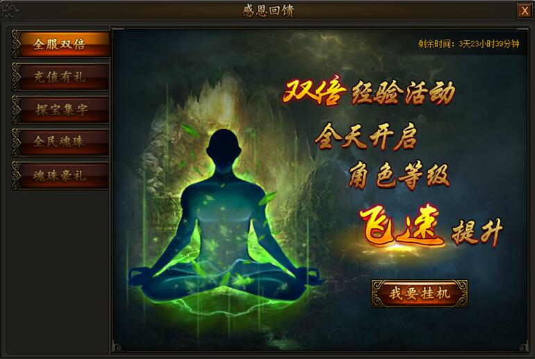 传奇霸业感恩回馈活动震撼来袭,丰厚奖励即刻领取! 活动一:全服双倍活动时间:2016年7月22日0:00~7月25日23:59活动期间,双倍经验活动全天开启,打怪练级事半功倍!全服双倍可和VIP多倍经验、经验卷 ...