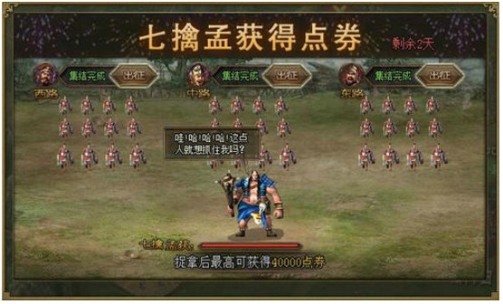 七擒孟获 活动一:三路大军连擒孟获,宝箱连开点券狂送!活动范围:8月8日(含)之前已开所有服 活动时间:8月28日0点至8月29日24点 参与条件:已开启世界地图 活动玩法:活动期间,通过任意战斗中的“借兵”(除单 ...