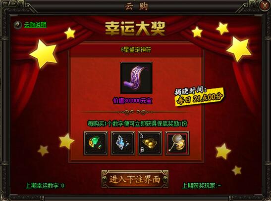 全民云购计划 九星鉴定神符花落谁家 活动时间:9月17日-9月17日云购奖品:九星鉴定神符第一条鉴定属性:HP上限【9星】第二条鉴定属性:攻击上限【9星】(使用神符附加属性时,道士为道攻上限、法师为魔攻上限,战士 ...