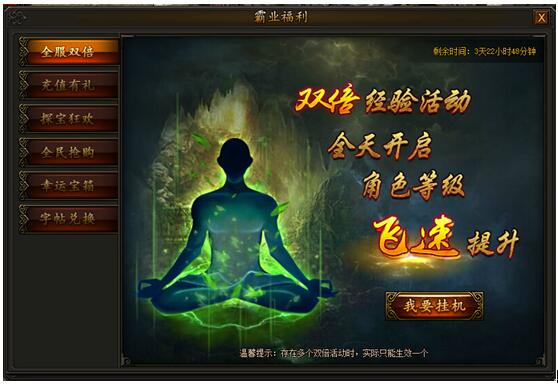 霸业福利,海量材料送不停! 1. 全服双倍活动时间:2016年11月6日00:00 — 11月9日23:59活动期间内即可获得双倍经验效果加成,可与其他双倍经验叠加。 ...