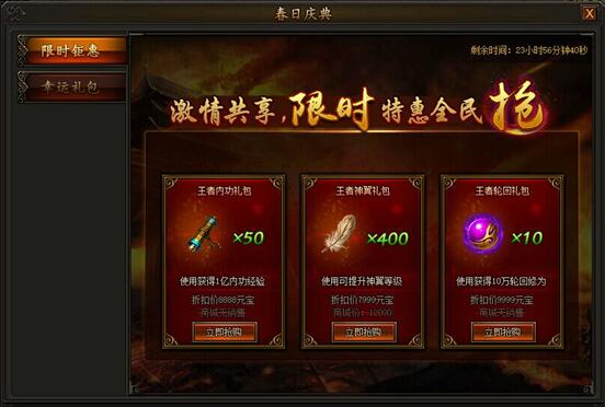 春日庆典,海量回馈! 1. 限时钜惠活动时间:2017年2月25日0点——2月26日23:59活动期间,内功、羽毛和轮回等材料礼包限时折扣,超低价格,不容错过! ...