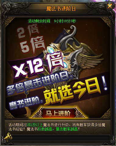 游戏充值新福利!实物奖品送不停! 点击此处参与 魔法书进阶暴击 活动时间:2017.3.17 00:00:00-2017.3.17 23:59:59 活动范围:所有已开启魔法书玩家 活动内容: 活动期间对2阶及以上的魔法书进行升级,将有概率 ...