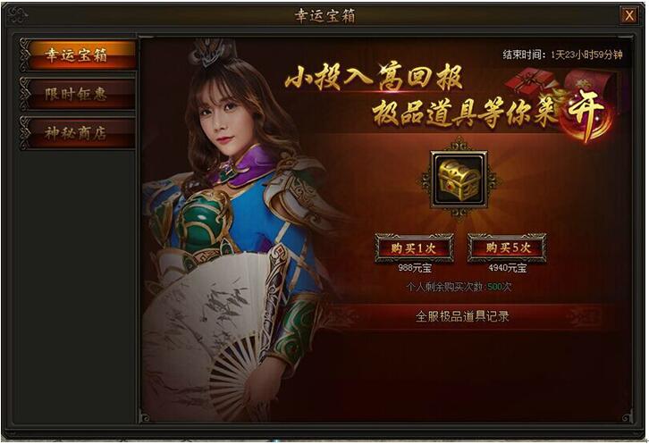 幸运宝箱,海量馈赠等你来! 1. 幸运宝箱活动时间:2017年3月29日0点——3月30日23:59活动期间,80级以上(包含80级)玩家每天最多可购买500次,打开幸运宝箱可随机获得一种道具,多买多得,极品道具等你来开! ...