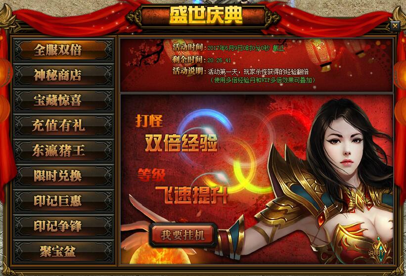 盛世庆典活动时间:6月8日-6月10日活动一:全服双倍活动详情:活动期间玩家打怪挂机可获得双倍经验加 ...